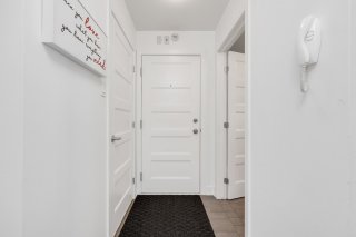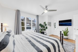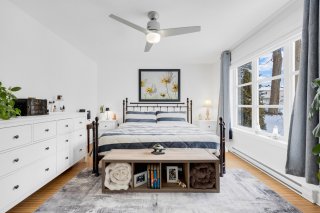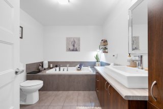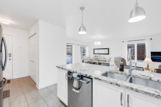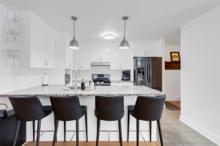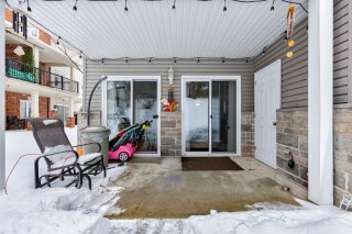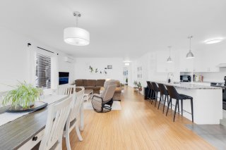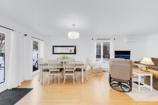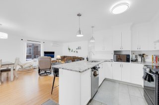 Bright and modern 2-bedroom condo in a desirable St-Lazare location with an open-concept layout, laminate flooring, and great natural light. The kitchen features white shaker cabinetry, a large island with seating, ceramic tile flooring, and a subway backsplash. Living and dining areas connect to a covered patio through sliding doors. The primary bedroom has triple-panel windows, and the second bedroom includes a Murphy bed. The bathroom offers a soaker tub, glass shower, and ample storage. Two outdoor parking spaces and a storage area complete this well-maintained home close to amenities, parks, and HWY 40.